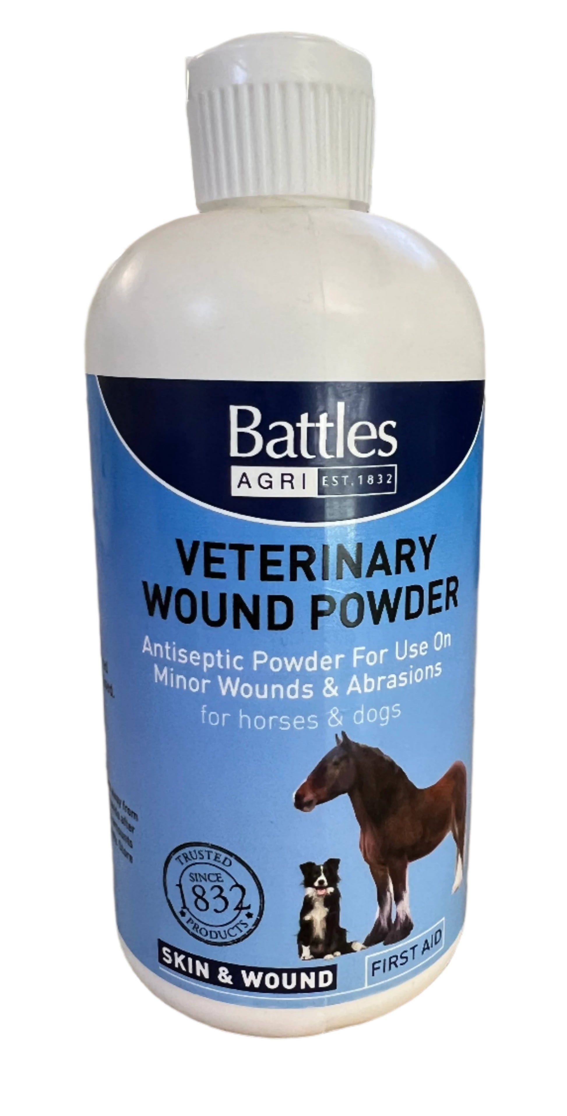Battles antiseptic powder designed for treating minor wounds and abrasions in horses and dogs.