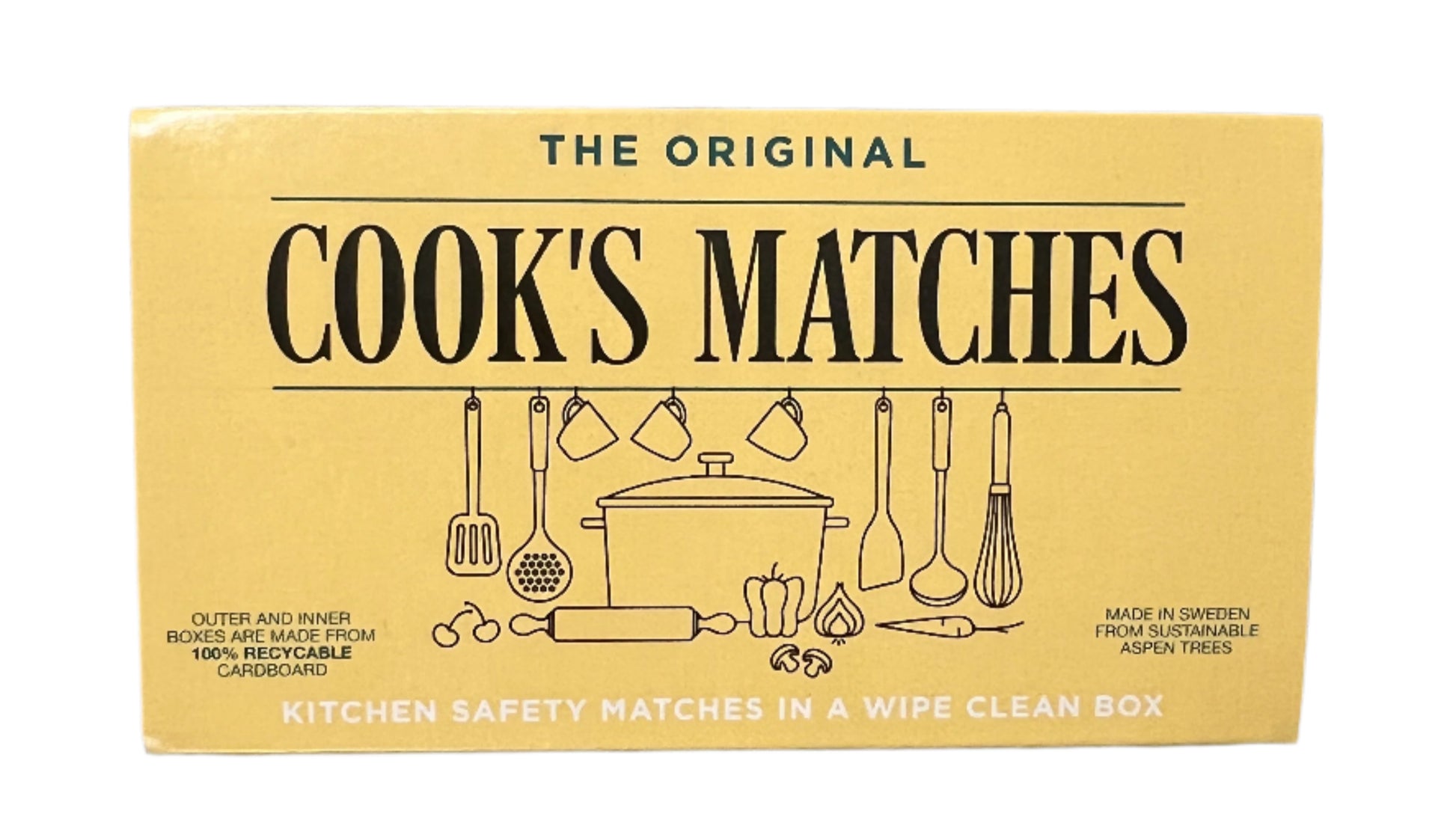 The Original Cooks Safety Matches come in a wipe-clean box crafted from sustainably sourced aspen trees in Sweden. Both the outer and inner boxes are made entirely from 100% recyclable cardboard, ensuring an eco-friendly and practical kitchen essential.