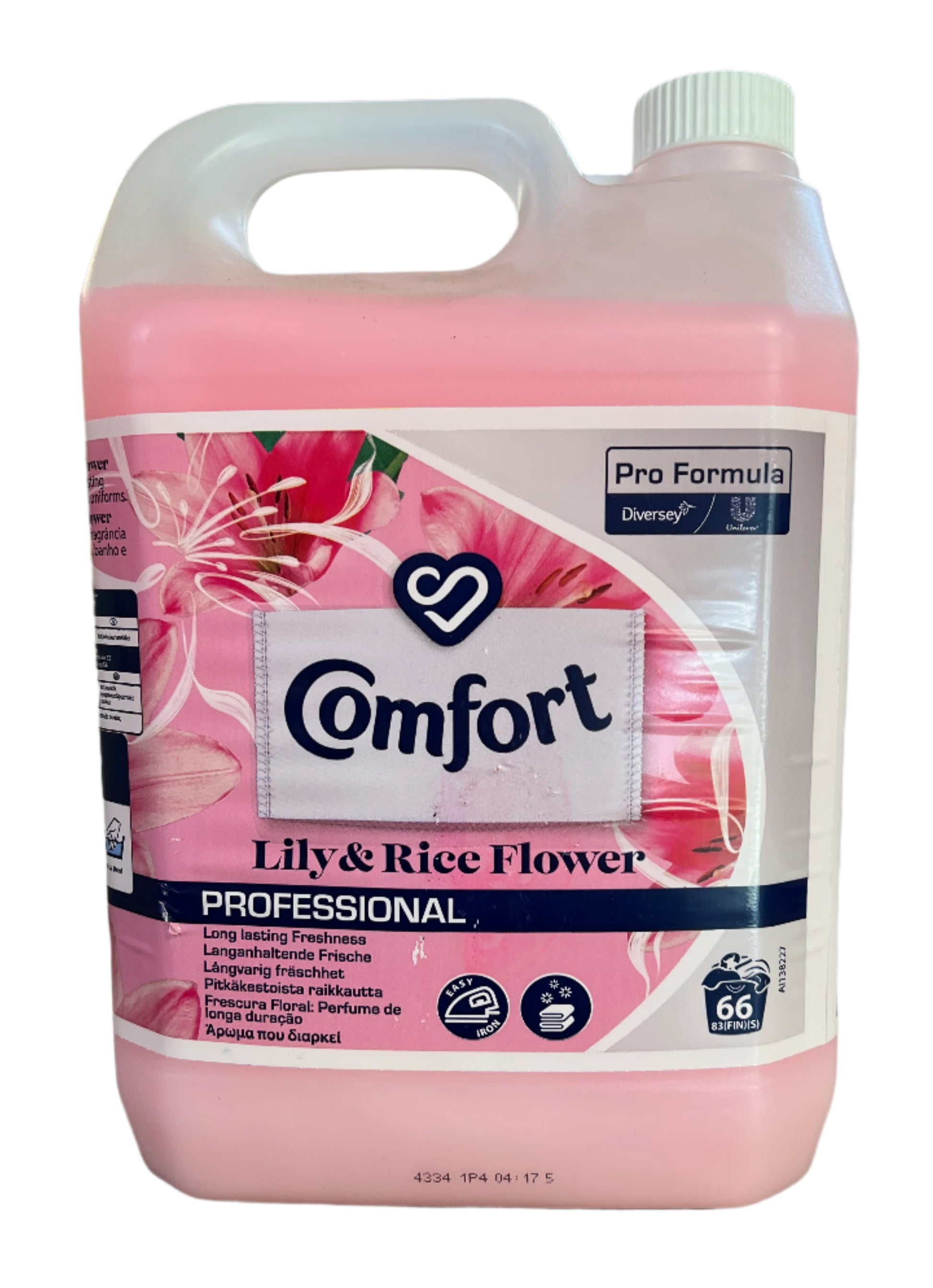 Experience the lasting freshness of Comfort Professional Lily & Rice Flower Fabric Softener. This 5-litre pro formula is designed to keep your fabrics soft and pleasantly scented for longer.