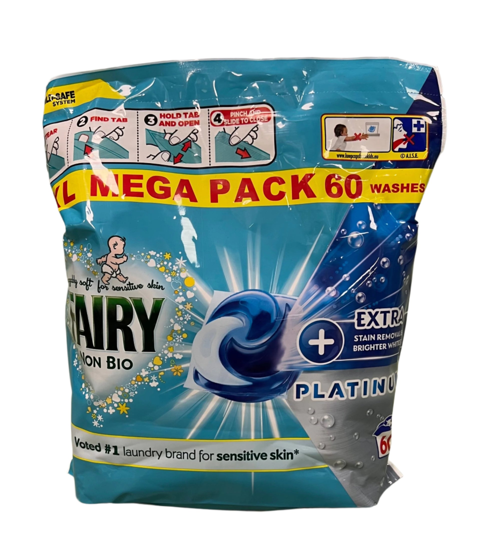 Fairy Non Bio Platinum Pods Laundry Detergent with Enhanced Stain Removal, Mega Pack for 60 Washes