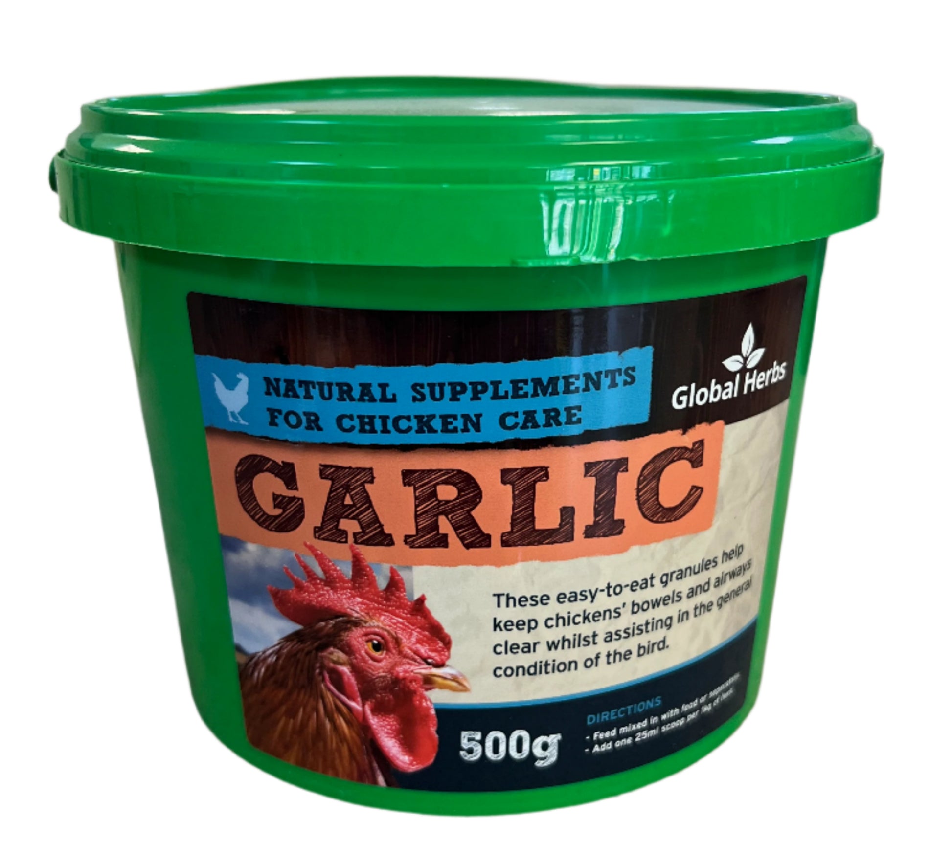 Global Herbs Garlic Natural Supplements for Chickens are palatable granules designed to support digestive health and respiratory function, promoting the overall well-being of your birds.