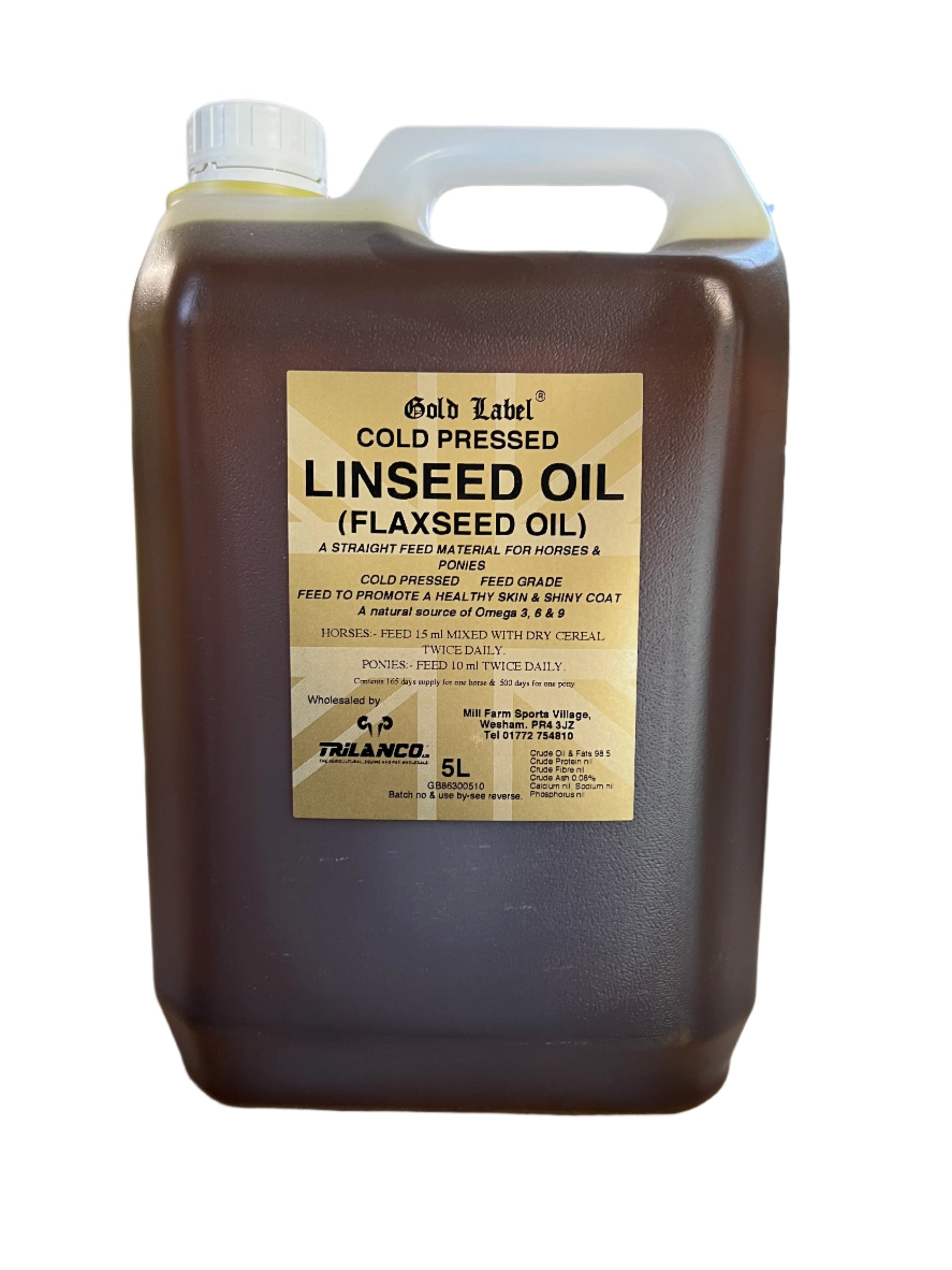 Gold Label Cold Pressed Linseed Oil (Flaxseed Oil) is a direct feed for horses and ponies that enhances coat health and shine. Available in a 5-litre size, it is a natural source of omega 3, 6, and 9.