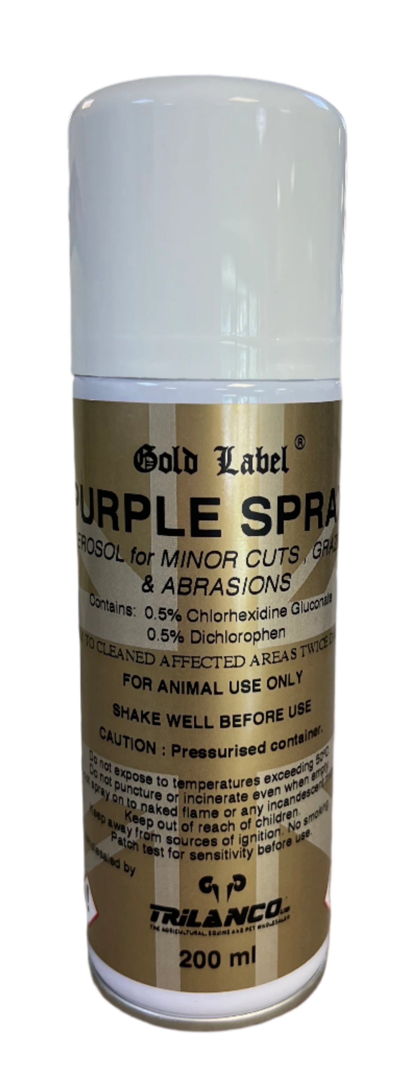 Gold Label Purple Spray is an anti-bacterial solution designed specifically for minor cuts, abrasions, and grazes on animals.