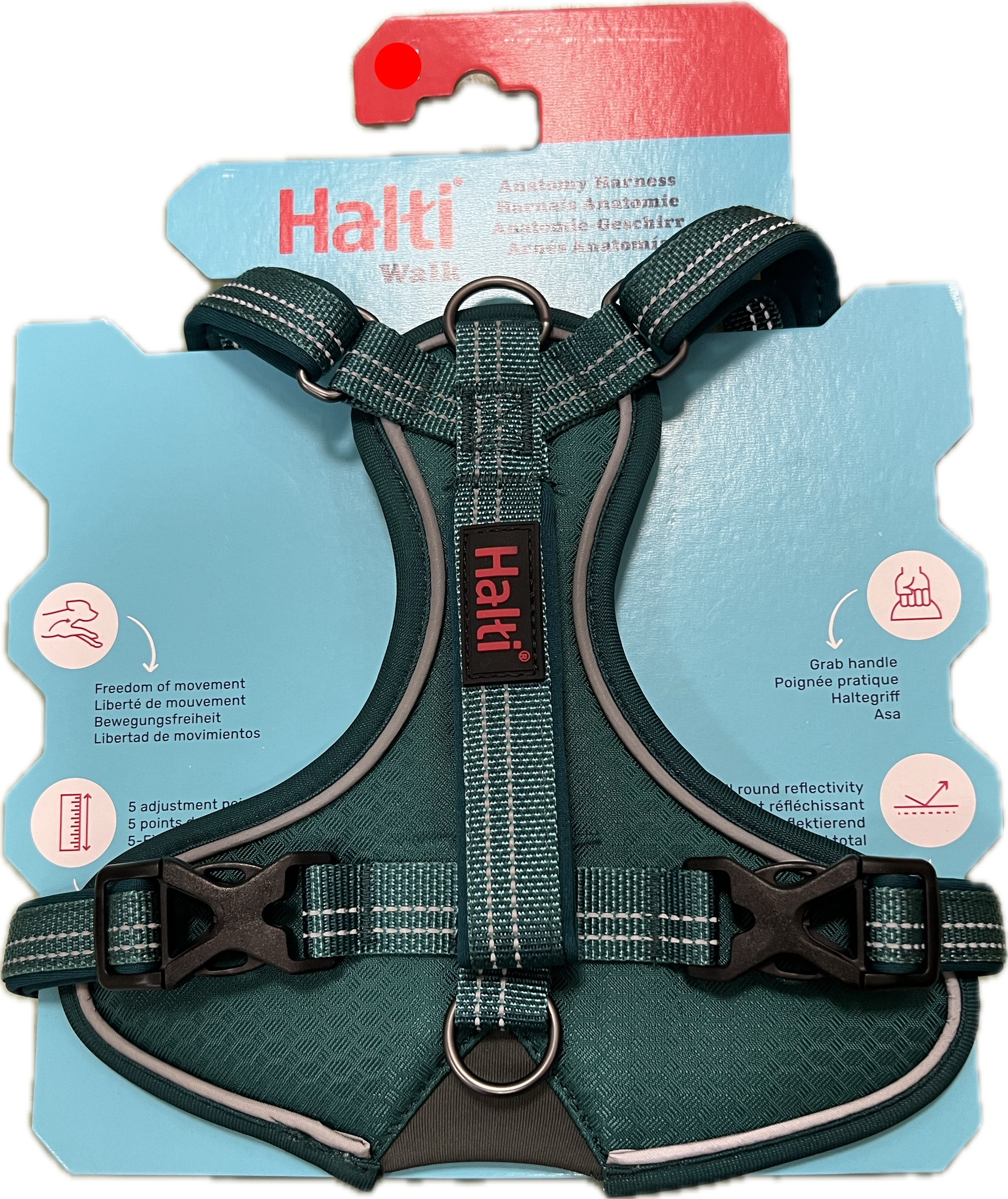 The Halti Walk Dog Anatomy Harness offers five adjustment points for a tailored fit that allows full freedom of movement. Equipped with a grab handle for improved control, it also incorporates all-around reflective detailing for increased safety. Available in sizes XS through XL and offered in Teal or Magenta.
