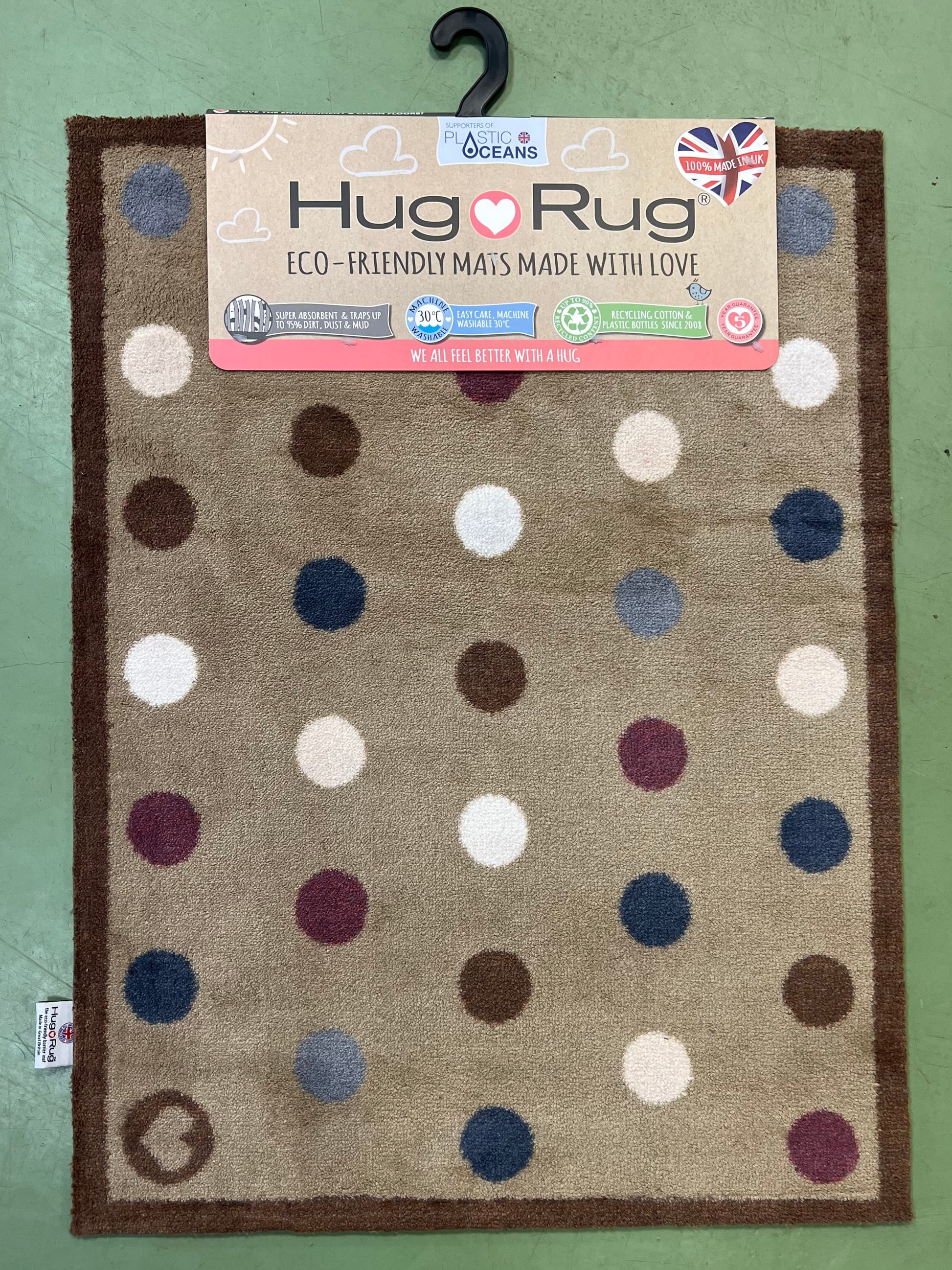 The Hug Rug Spot 10 mat features a light brown base adorned with darker spots in shades of blue and red, accented by touches of white and cream, all framed by a dark brown border. Highly absorbent, it captures up to 95% of dirt, dust, and mud. Machine washable at 30°C, this mat is made from up to 90% recycled bottles, demonstrating a strong commitment to sustainable manufacturing. Combining practicality with eco-conscious design, it offers both effective performance and environmental responsibility.
