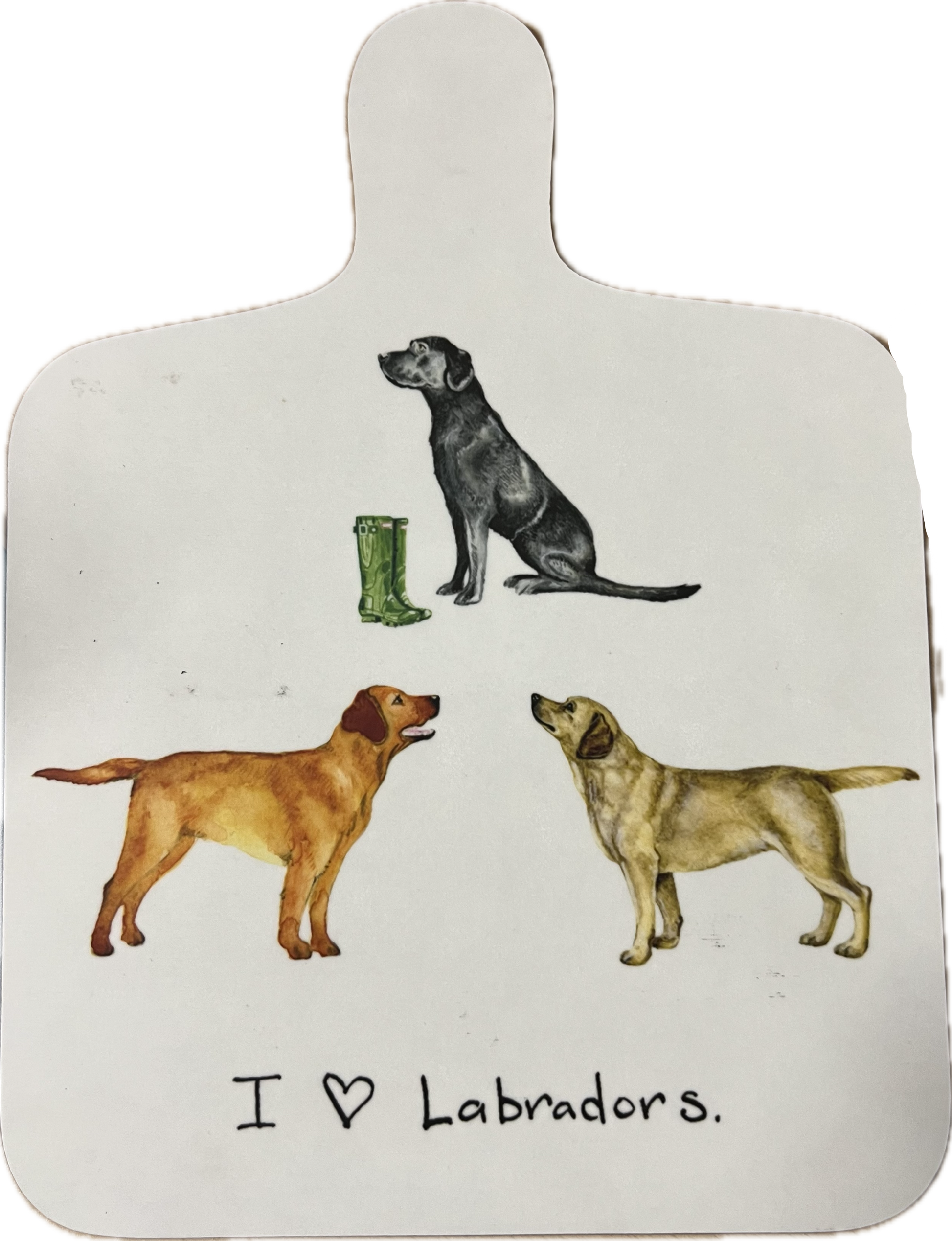 The I Love Labradors Mini Chopping Board features images of three Labradors in different colours, combining functionality with charming design.