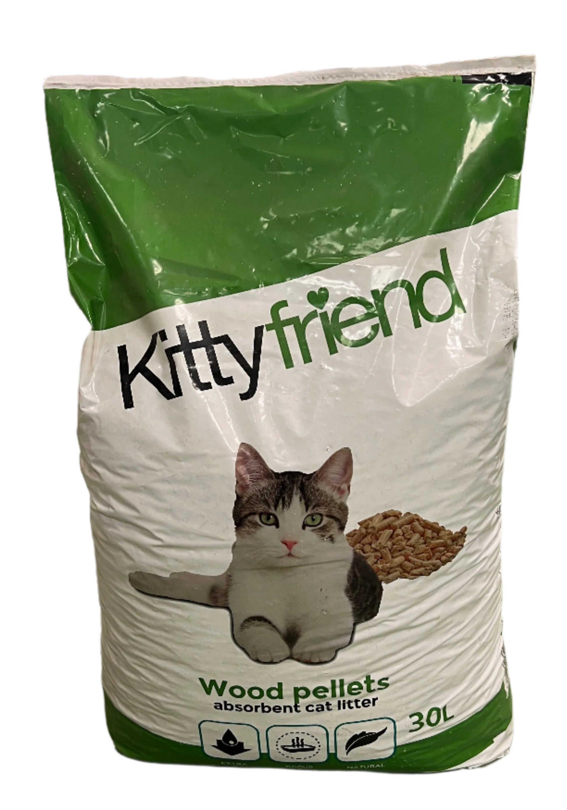 Kitty Friend Wood Pellets 30L are an absorbent cat litter option made from natural wood pellets.
