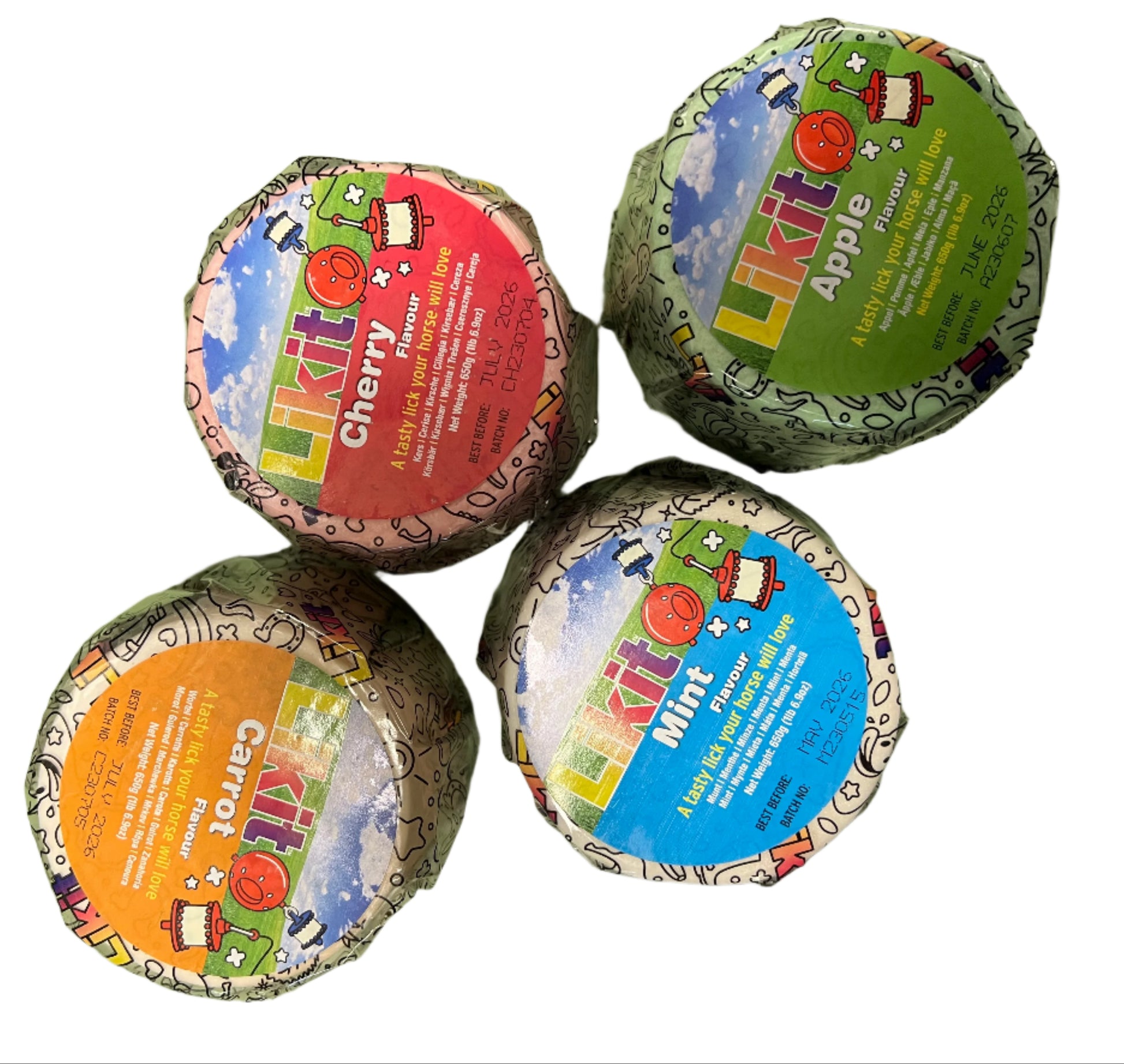 Likits designed for use with separately sold Likit holders, help alleviate boredom and stress in horses. Available in assorted flavours, you will receive one of the following depending on stock: cherry, carrot, apple, or mint.