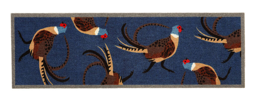 The My Pheasant runner showcases a rich blue background adorned with several pheasants. Crafted from recycled plastic bottles, this washable and sturdy indoor mat includes a non-slip backing to ensure safety.